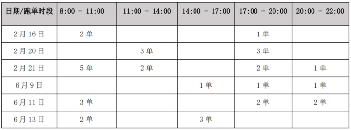 截至目前,他分别于2月16日、2月20日、2月21日、6月9日、6月11日、6月13日上线跑单,日均跑单约2小时,每天跑单量从3单到10单不等。